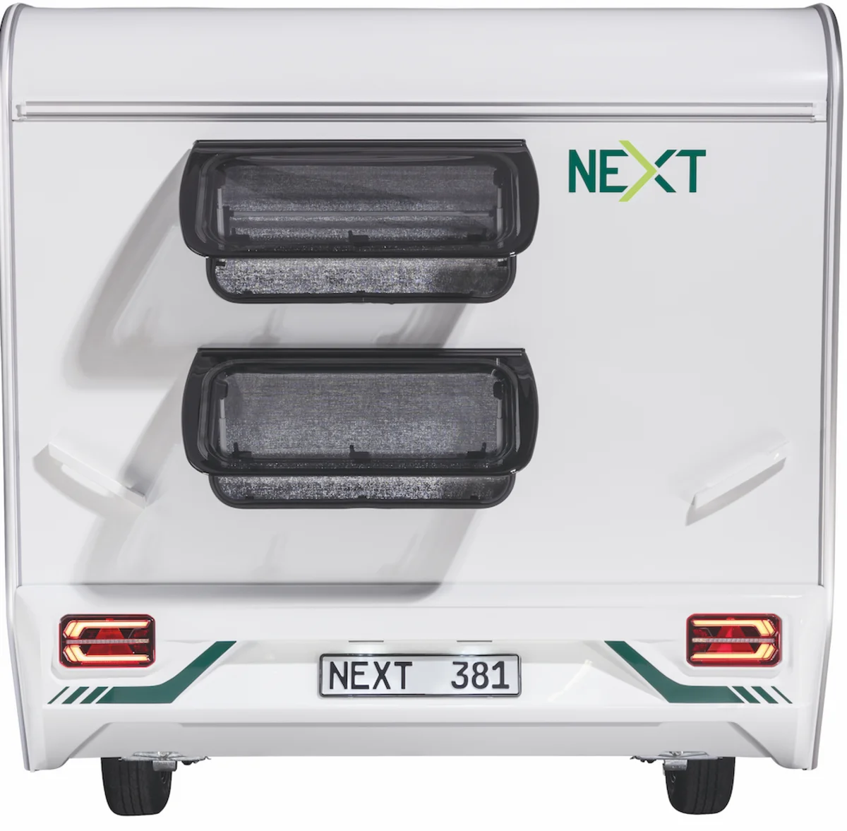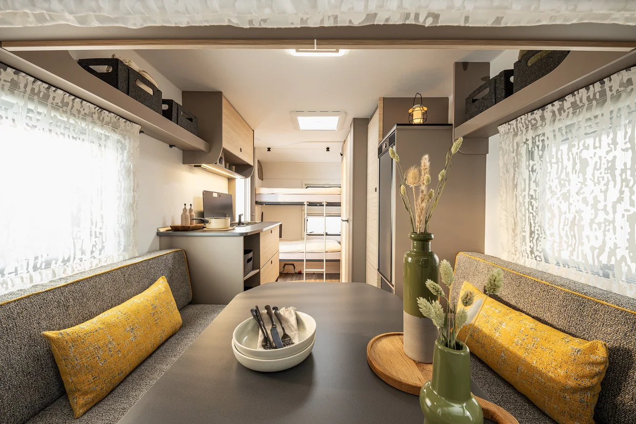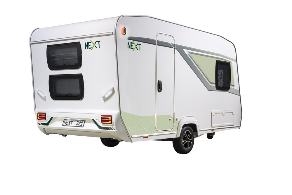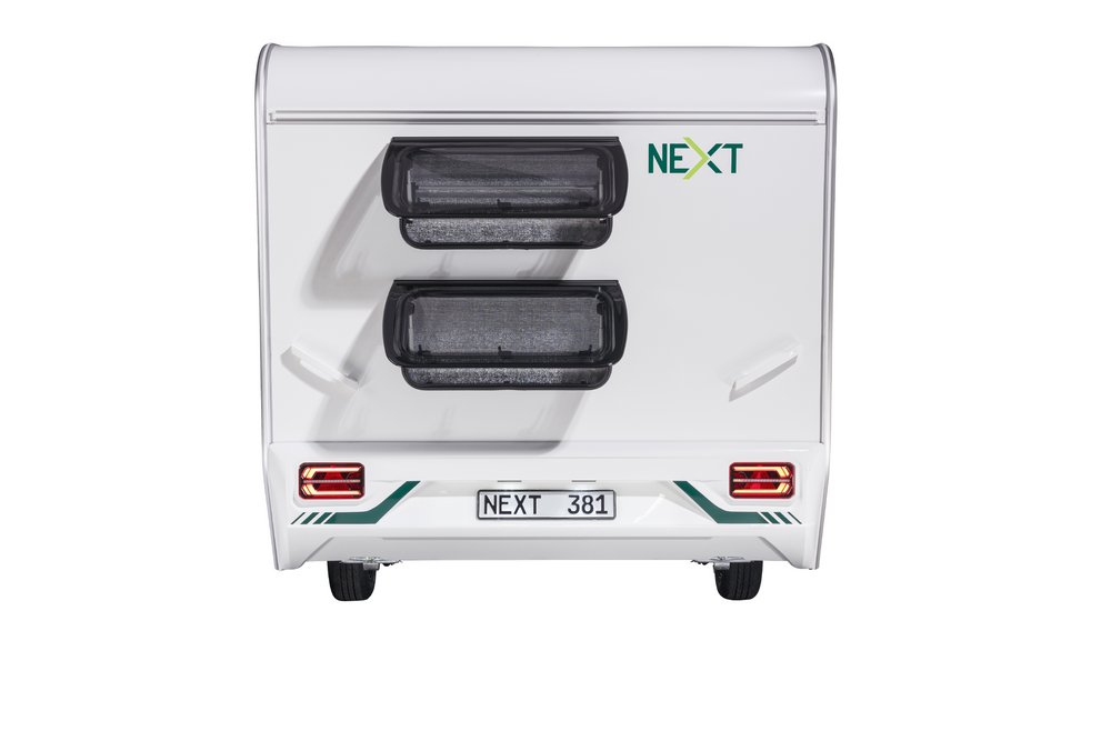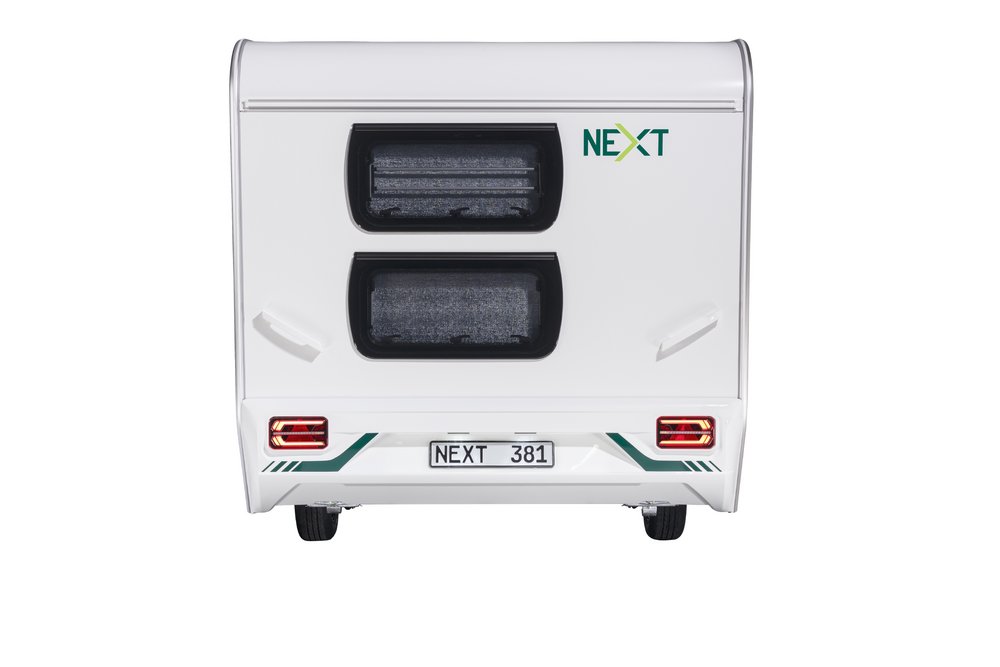 The NEXT 381 has everything that next-generation campers could wish for: 4 sleeping places, a sturdy chassis, high-quality insulation, a fresh water tank with external filling, heating, a kitchenette with a 2-burner hob, storage space, and a separate bathroom area with a toilet.