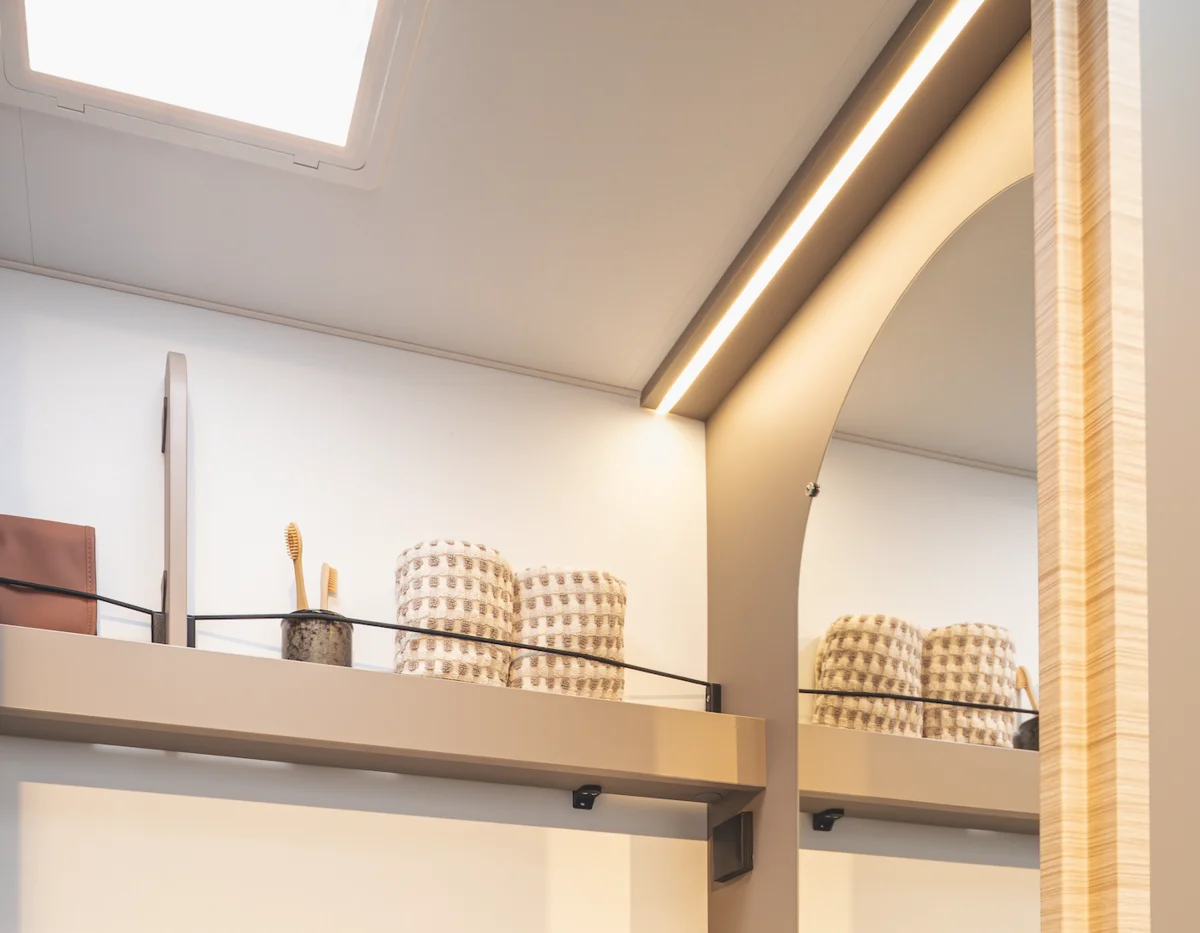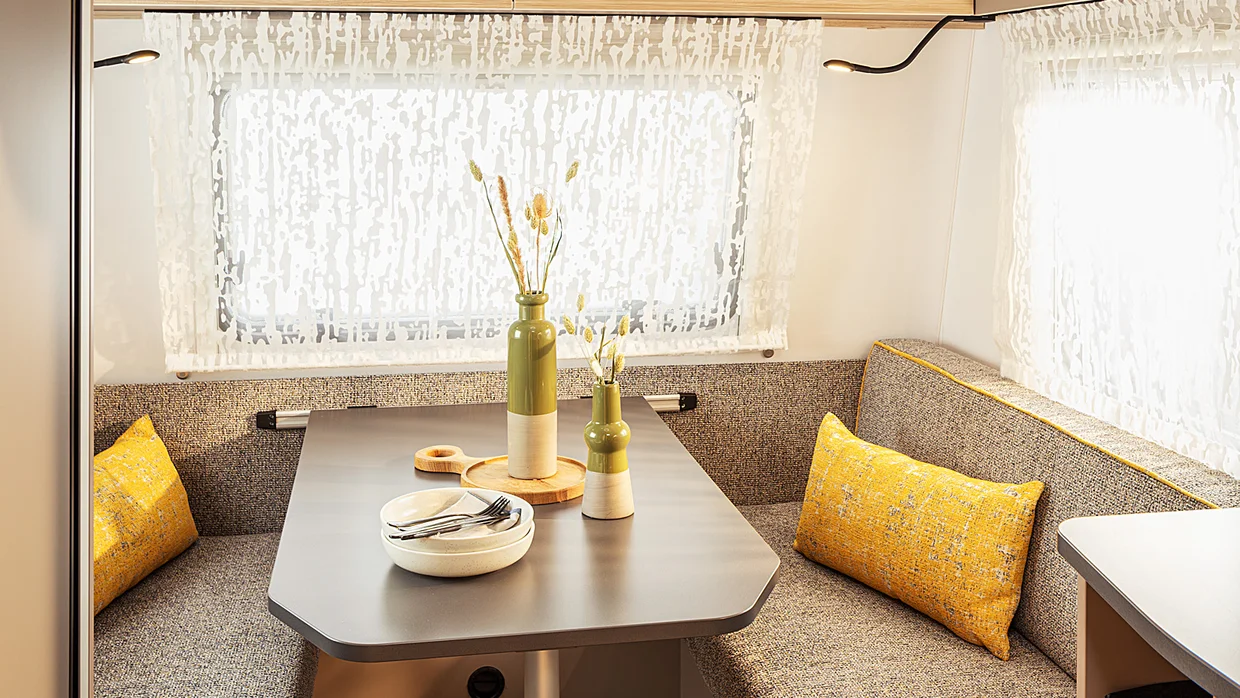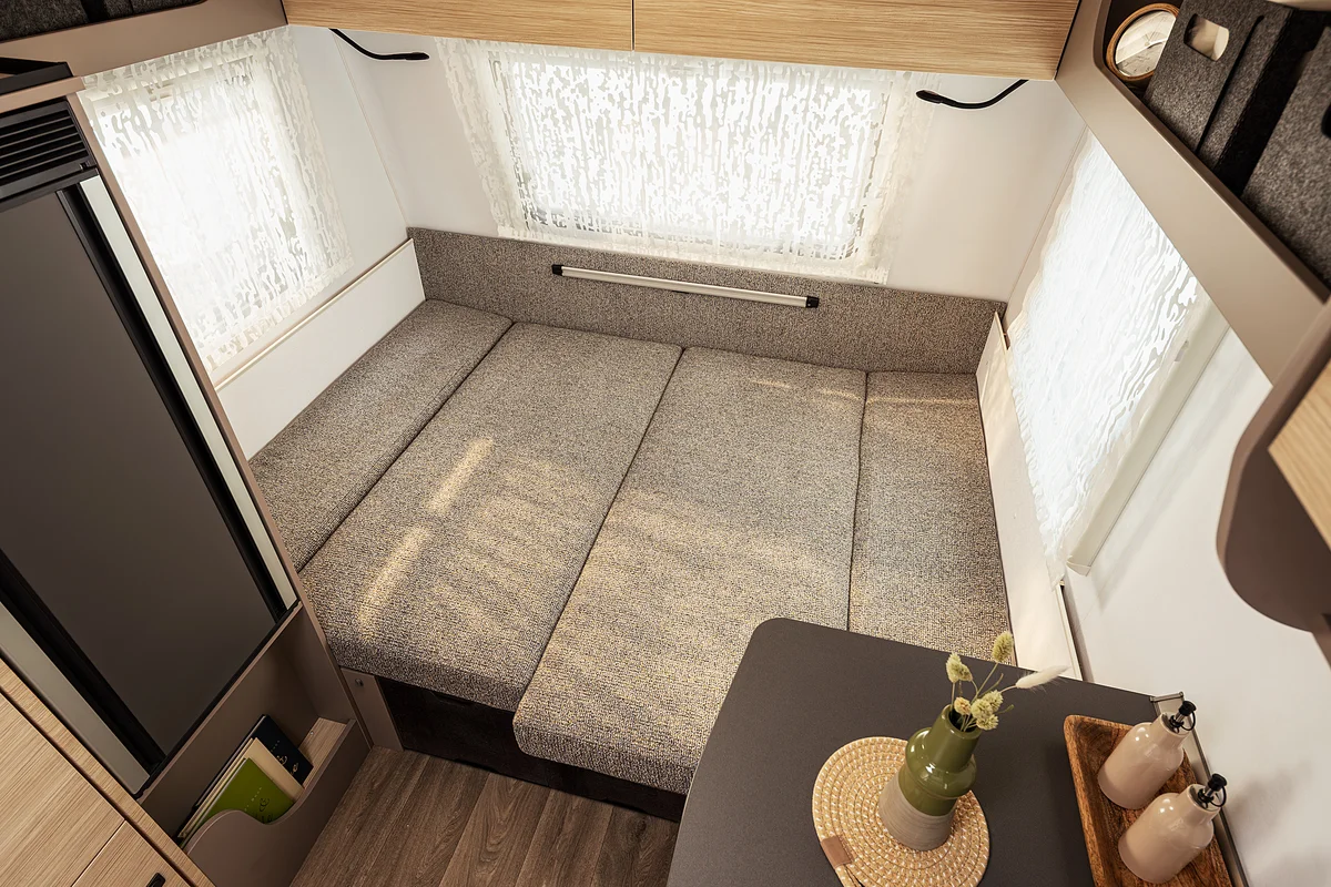 Your favorite place on four wheels: the seating area invites you to linger. Three generous windows bring light and nature into the interior. Atmospheric LED lighting creates a cozy atmosphere, while practical roller blinds ensure privacy. When night falls, the seating area can be converted into a comfortable double bed in just a few simple steps.