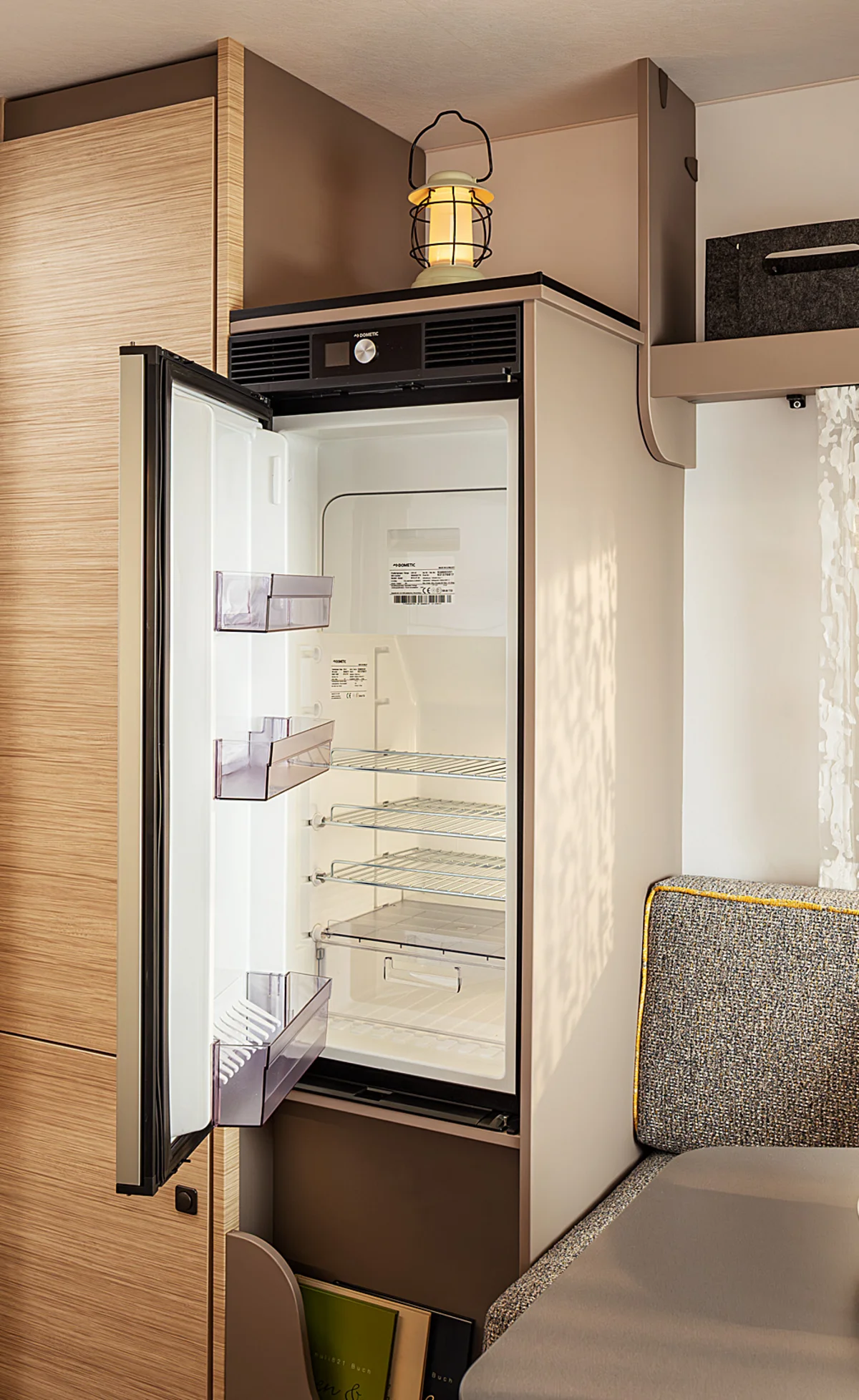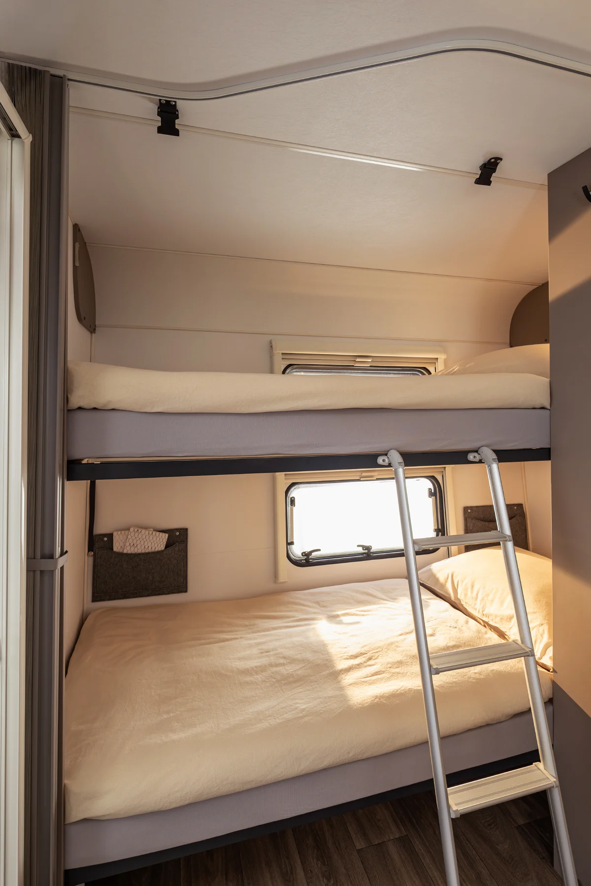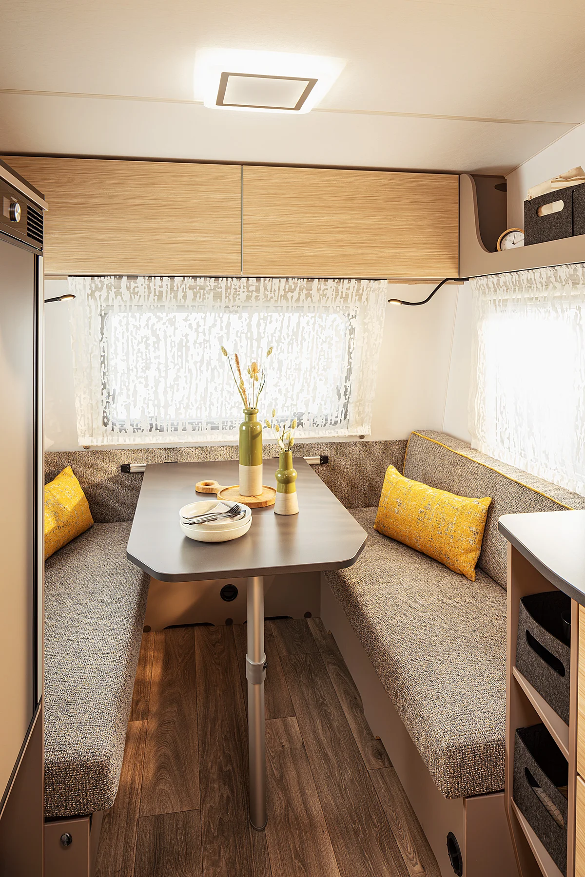 Your favorite place on four wheels: the seating area invites you to linger. Three generous windows bring light and nature into the interior. Atmospheric LED lighting creates a cozy atmosphere, while practical roller blinds ensure privacy. When night falls, the seating area can be converted into a comfortable double bed in just a few simple steps.