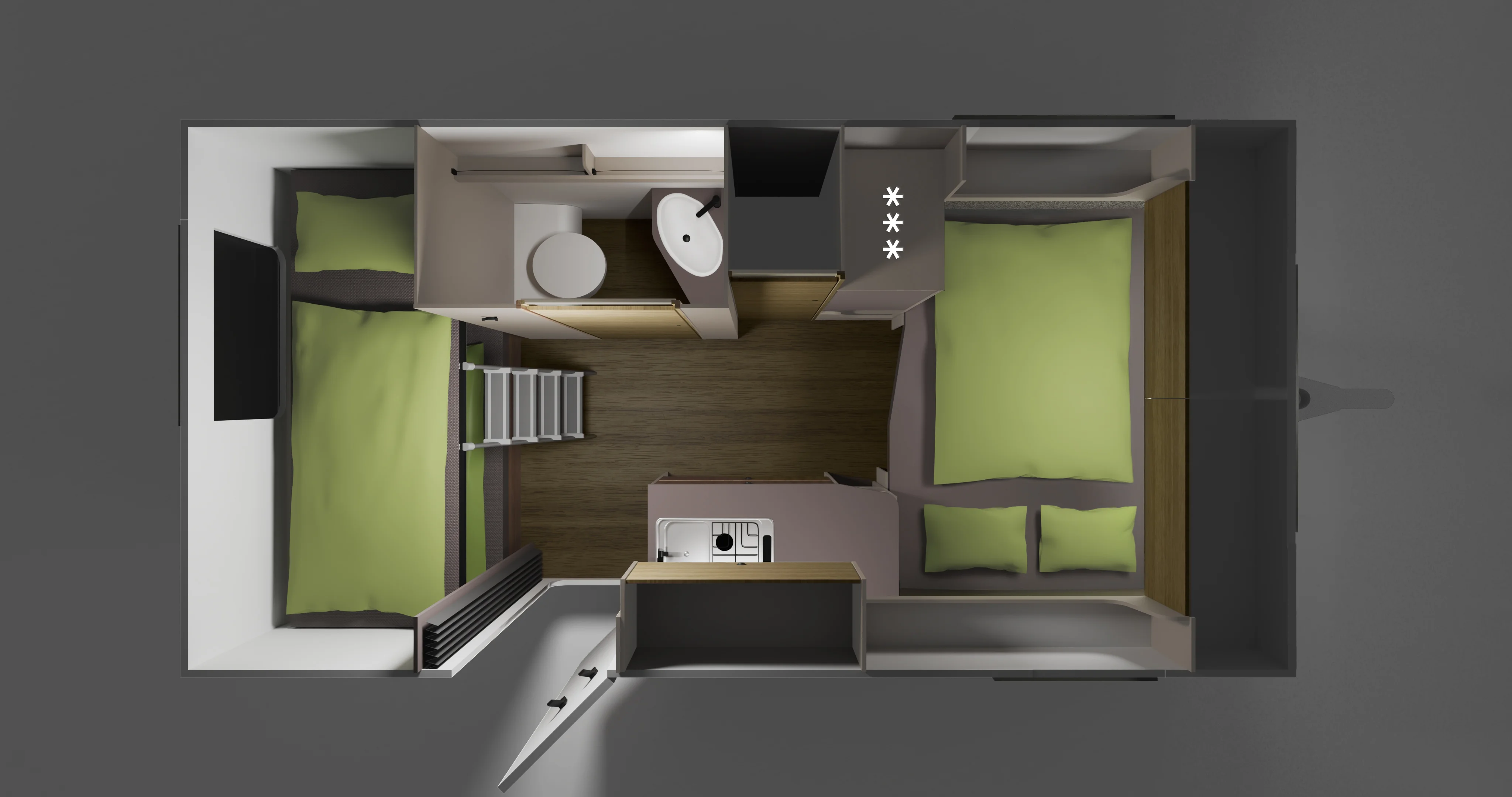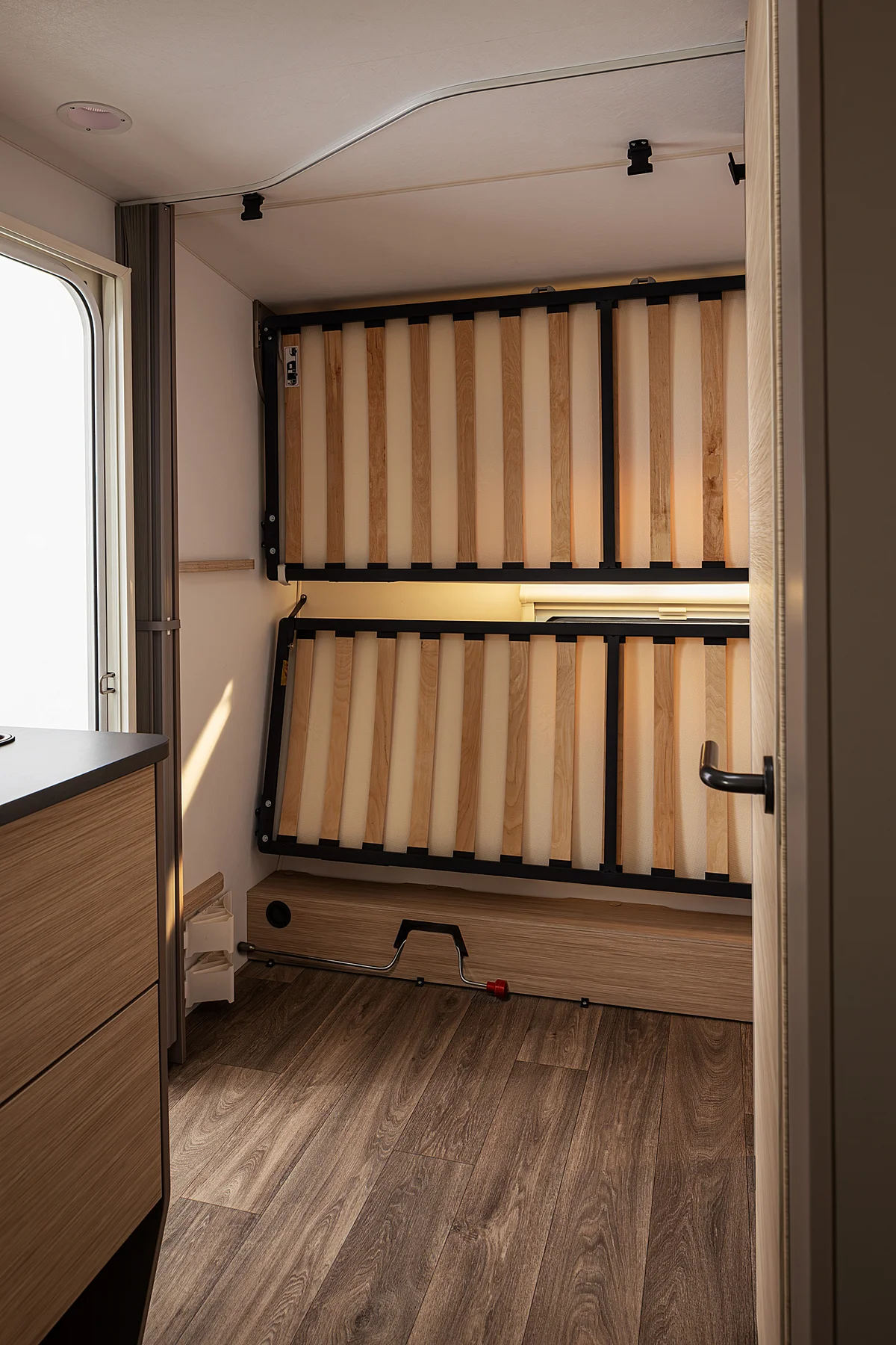 Smart use of space: bunk beds that fold away create space to live during the day. Places to sleep at night, space to live during the day—NEXT adapts to your rhythm.